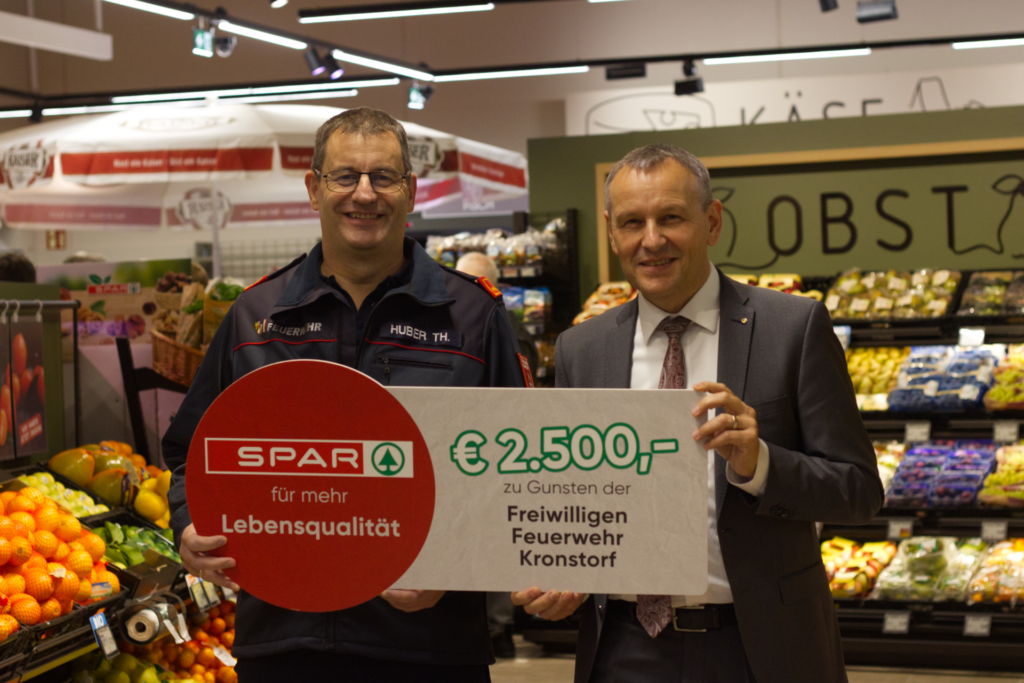 Im Rahmen der Eröffnung der neuen Spar Filiale in Thaling am 28.10.2025, zu der auch Vertreter der FF Kronstorf eingeladen waren, durfte OBI Thomas Huber für die Feuerwehr 2.500 € entgegennehmen, mit denen SPAR die Anschaffung von Bekleidung für die Feuerwehr unterstützt.