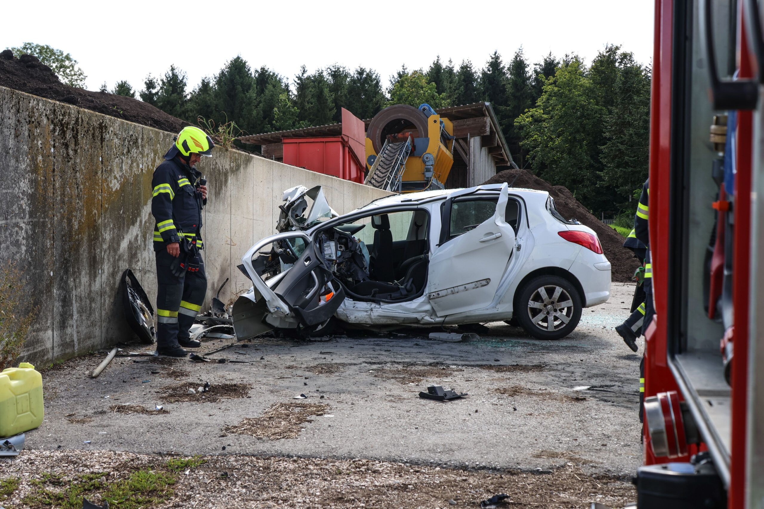 Beim Eintreffen an der Einsatzstelle stellte sich heraus, dass ein Pkw aus bislang ungeklärter Ursache gegen eine Betonmauer geprallt war. Die Feuerwehr Dietach begann umgehend – unterstützt durch unsere Kräfte – mit der Rettung der eingeklemmten Person.